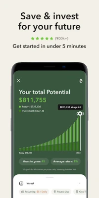 Your money is automatically invested into one of our diversified, ETF portfolios, built by experts and recommended for you. You can invest spare change each time you make a purchase with Round-Ups®, or set up automated recurring investments starting as low as $5.