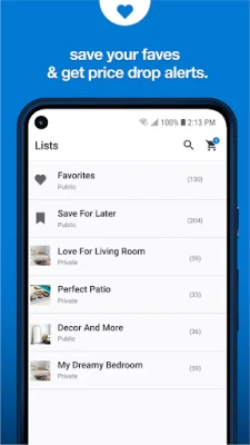 • Shop for furniture and decor with app-exclusive deals and discounts.