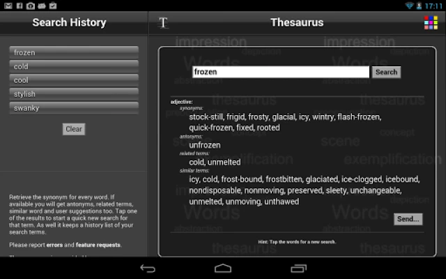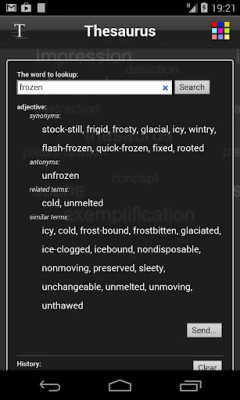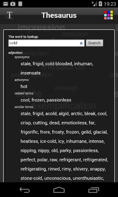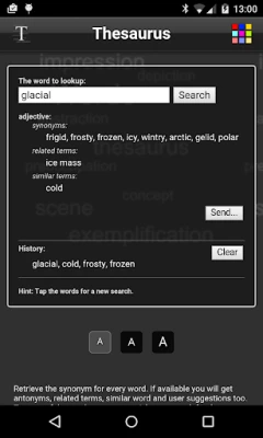 Retrieve the synonym for every word. If available you will get antonyms, related terms, similar word and user suggestions too. Tap one of the results to start a quick new search for that term. It keeps a history list of your search terms as well.