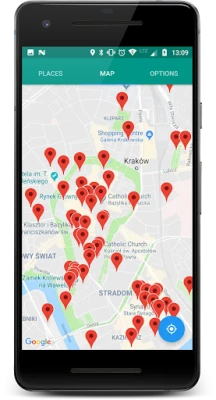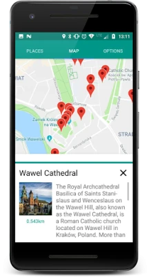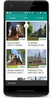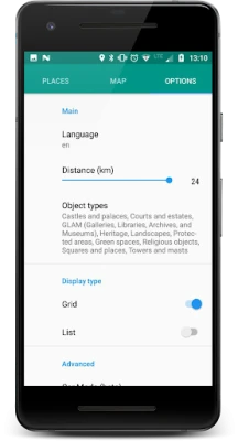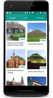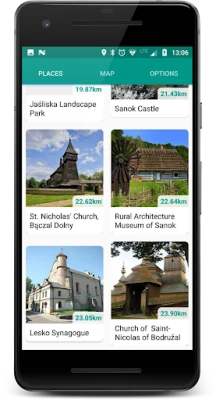 App uses GPS and looking for attractions near you. You can define type of place and radius of searching (default 12km).